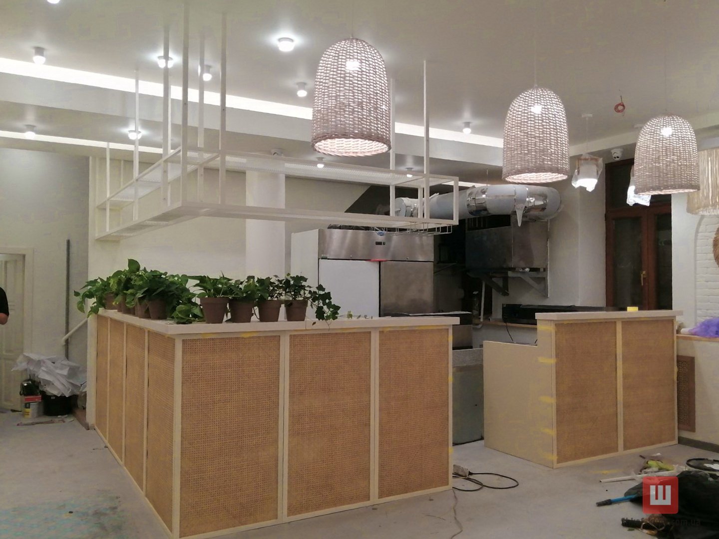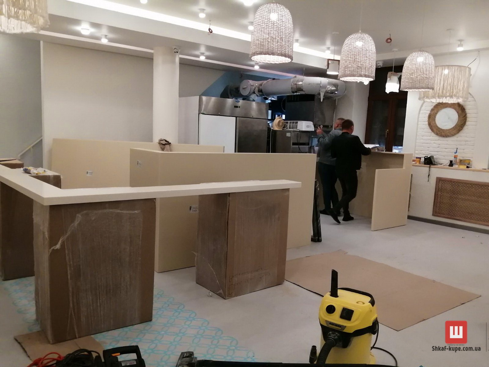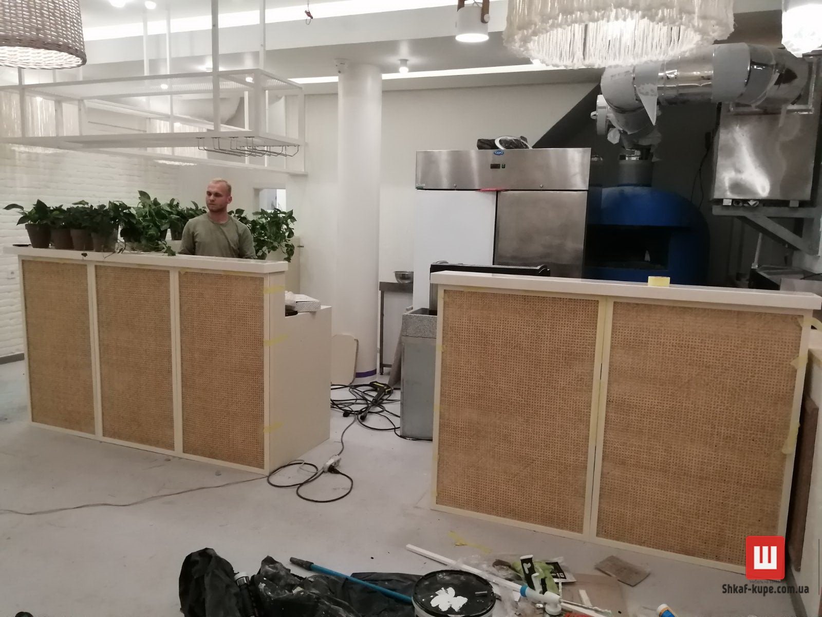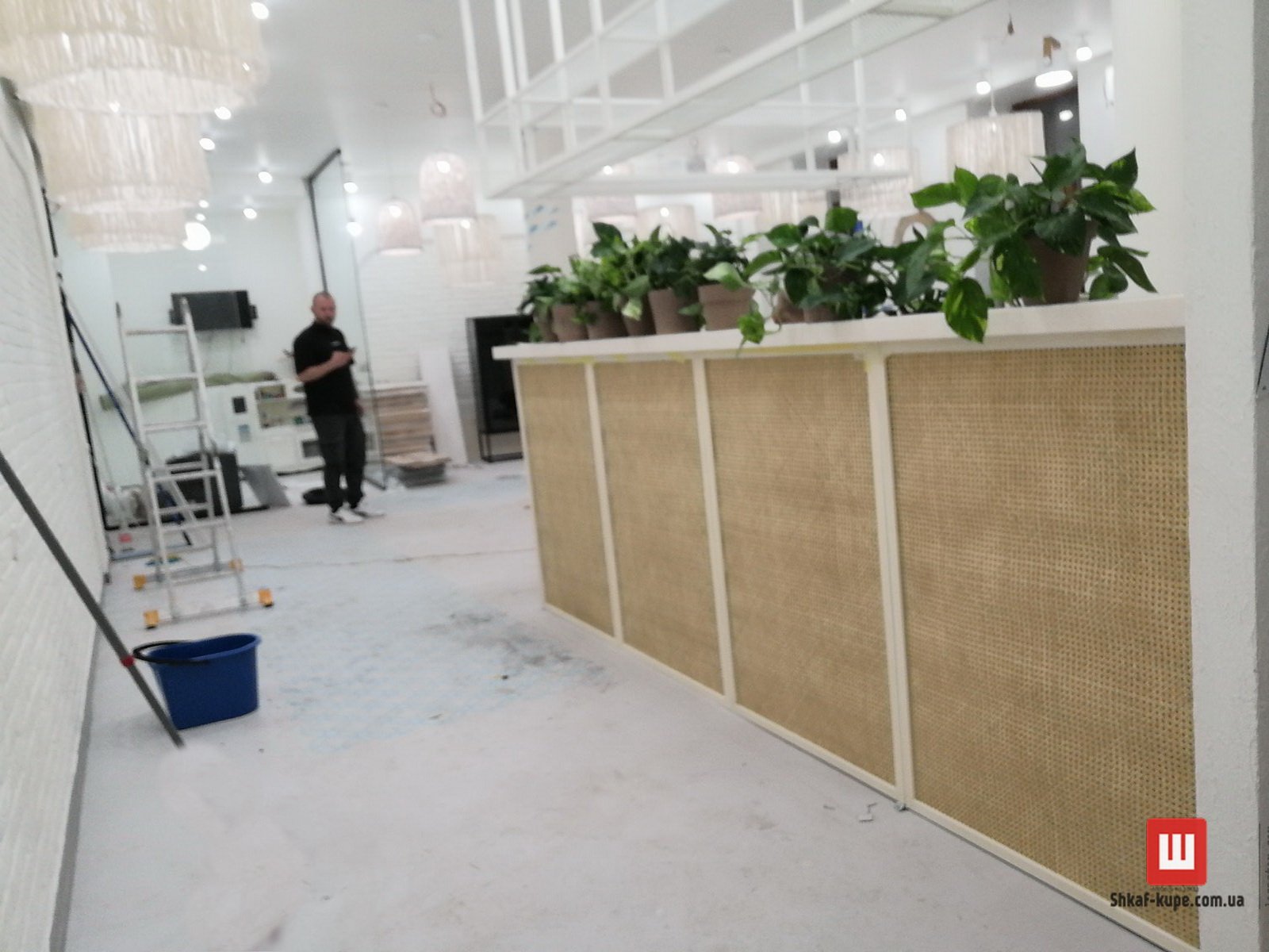 - Освещение: Варианты освещения могут включать встроенные светодиодные подсветки, подсветку над стойкой или вокруг нее, которые создадут эффектный визуальный акцент.